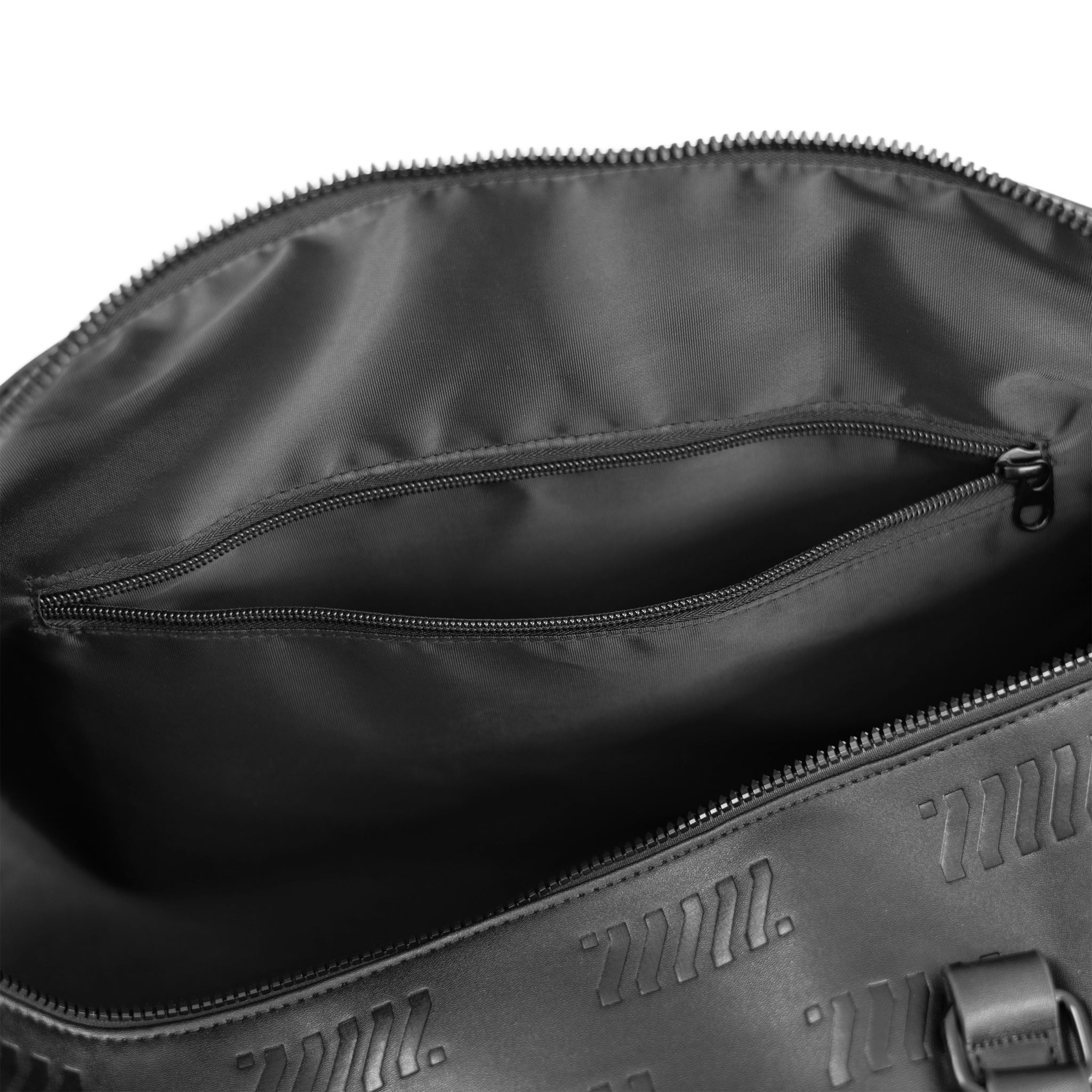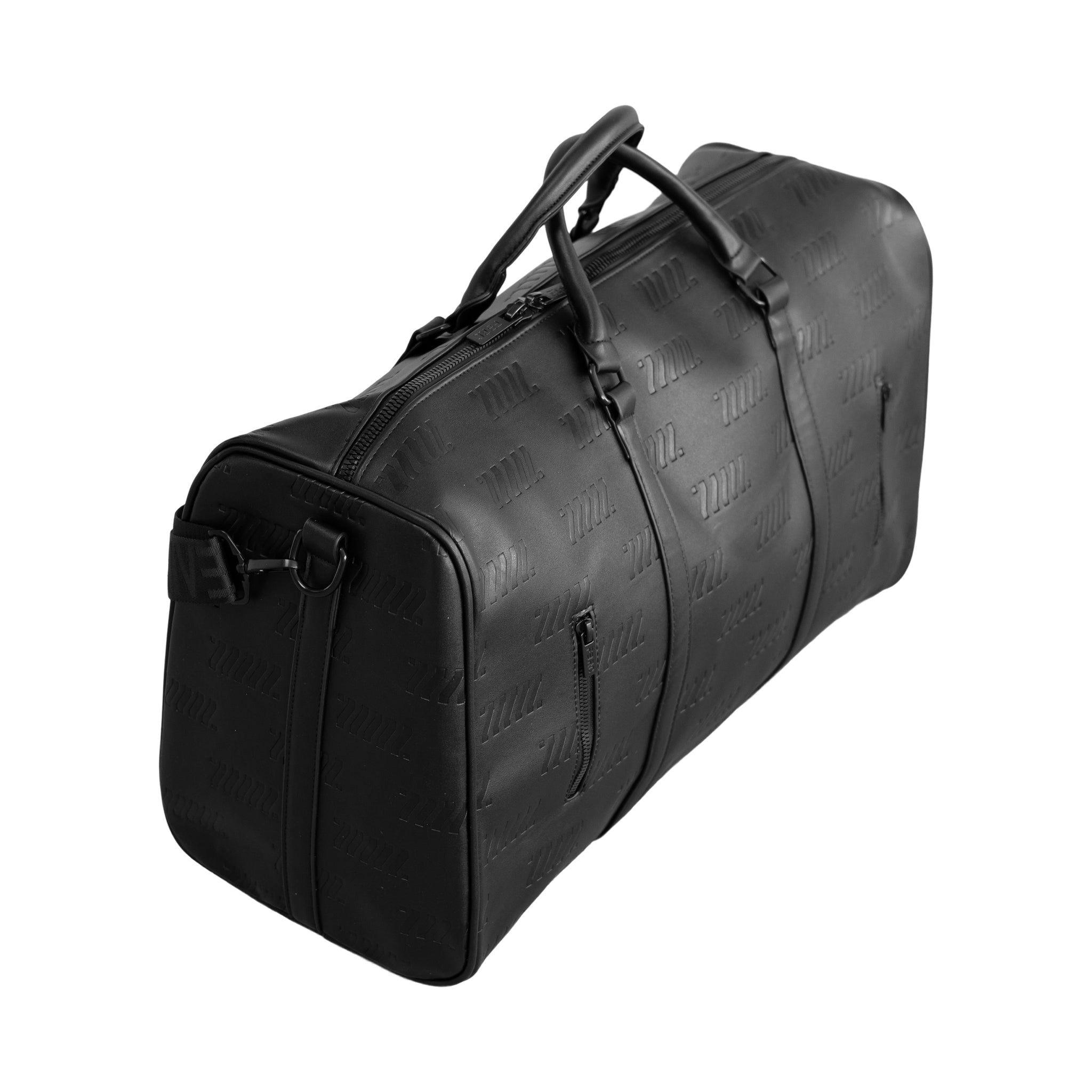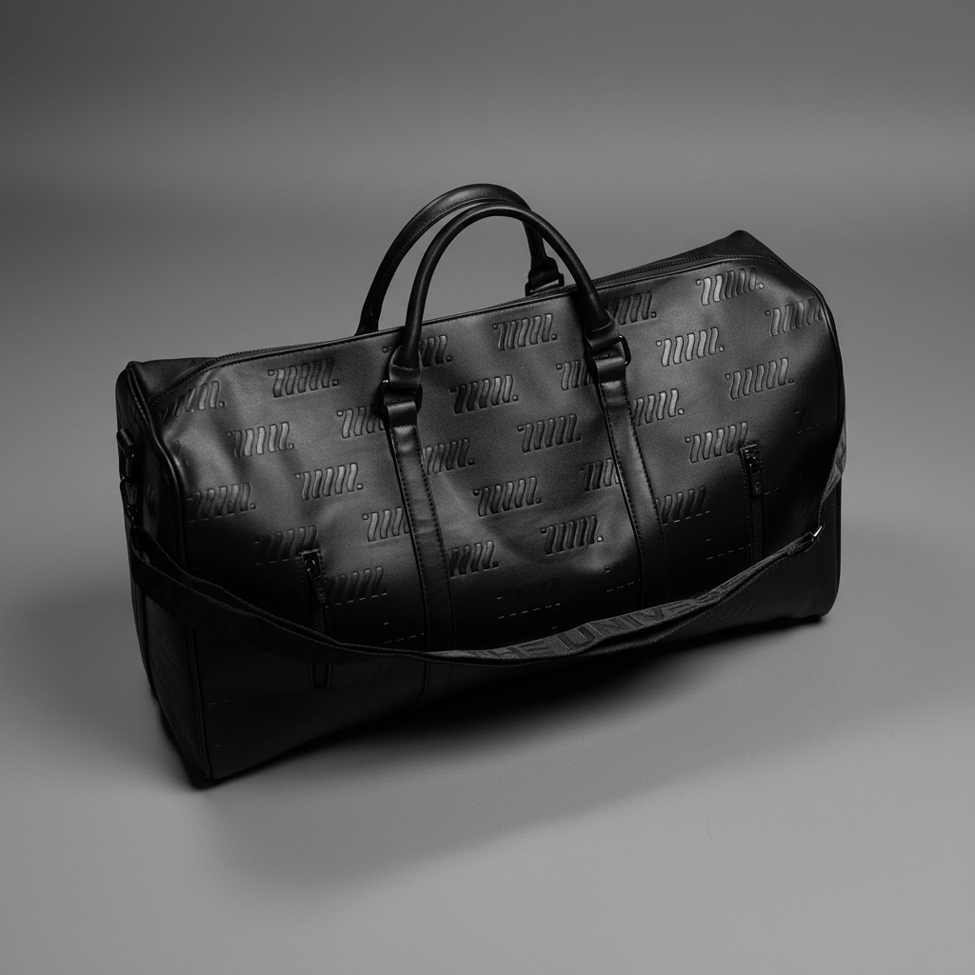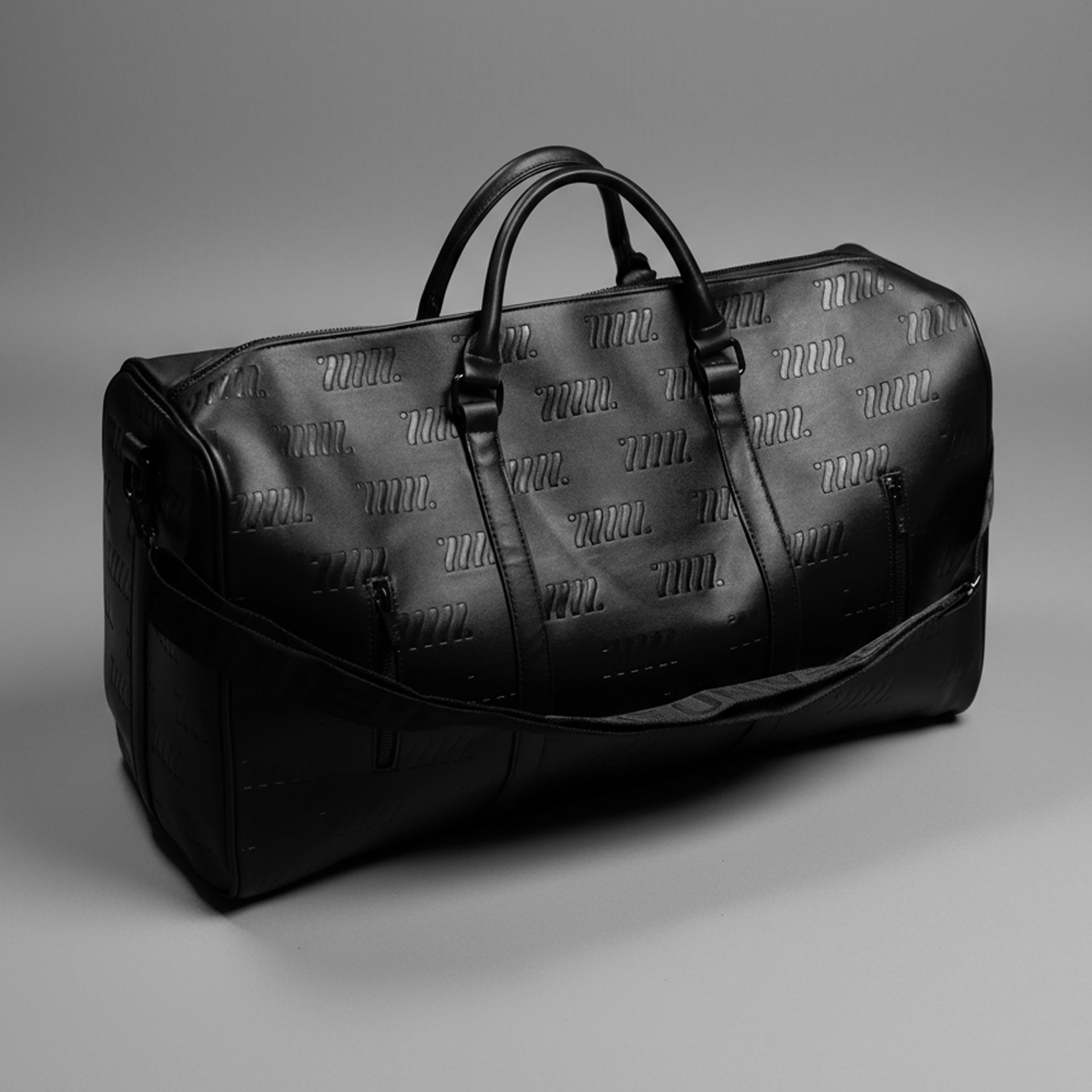 Fabric of the Universe presents the BG-Type 10M Shadow Monogram Travel Duffel Bag, crafted from tough, rigid faux leather for lasting durability. Its debossed monogram design adds a bold, sophisticated touch, while the woven logo shoulder strap enhances the sleek all-black style. Designed with a latch sleeve, it easily attaches to luggage carriers for convenience. Spacious enough to hold all your essentials and more, this exclusive limited edition bag is one of just 99 pieces, making it a rare and stylish travel companion.