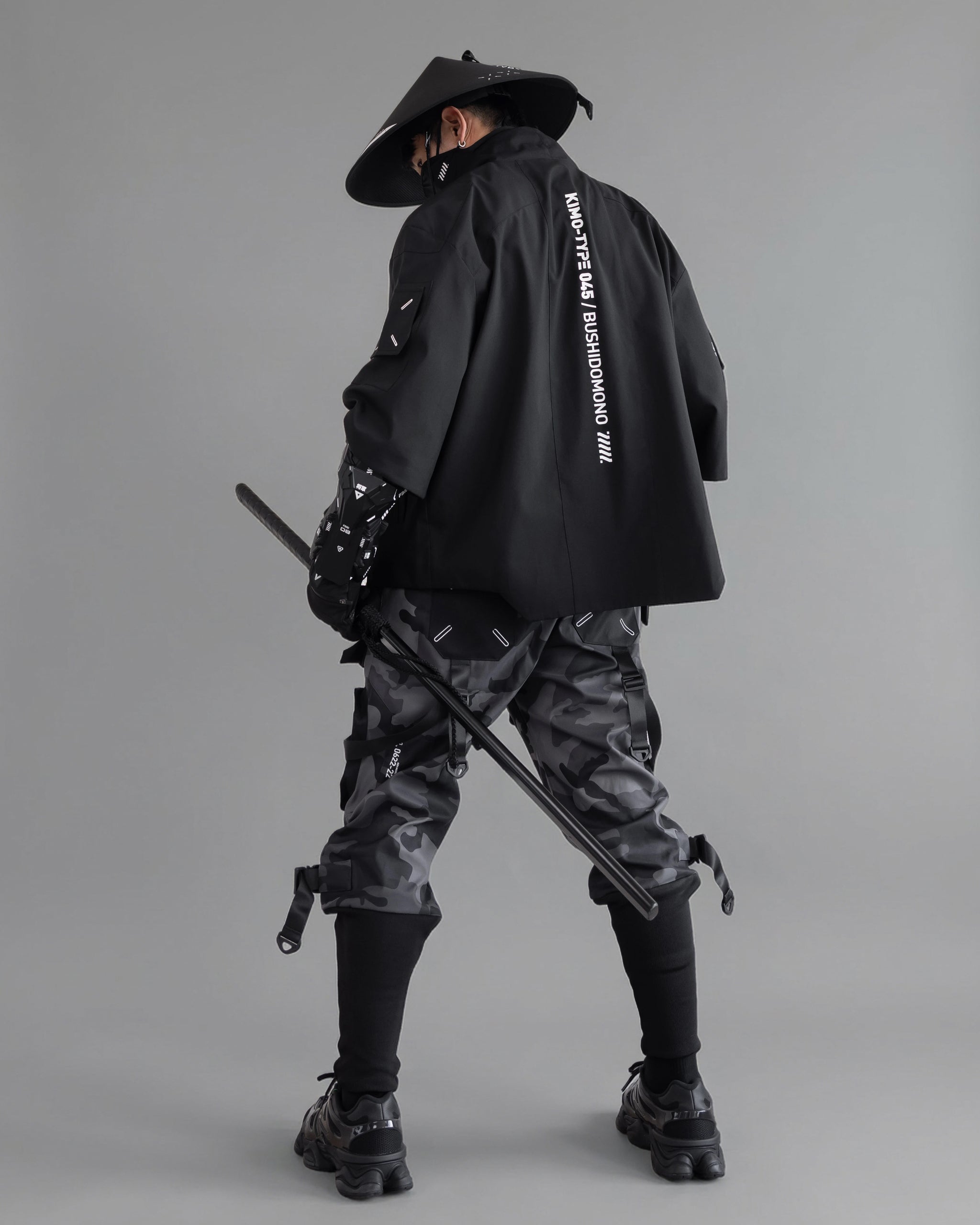 The Kimo-Type 045 Black Kimono Shirt features a timeless kimono design with wide 3/4 sleeves and a lightweight fabric that ensures comfort. Its broad shoulder cut offers a flattering fit, while signature logos are subtly printed across the shirt for a distinctive look. Two buckle closures secure the front, complemented by an inner mesh liner for added breathability and ease of wear. This shirt combines traditional style with modern details for a unique wardrobe staple.