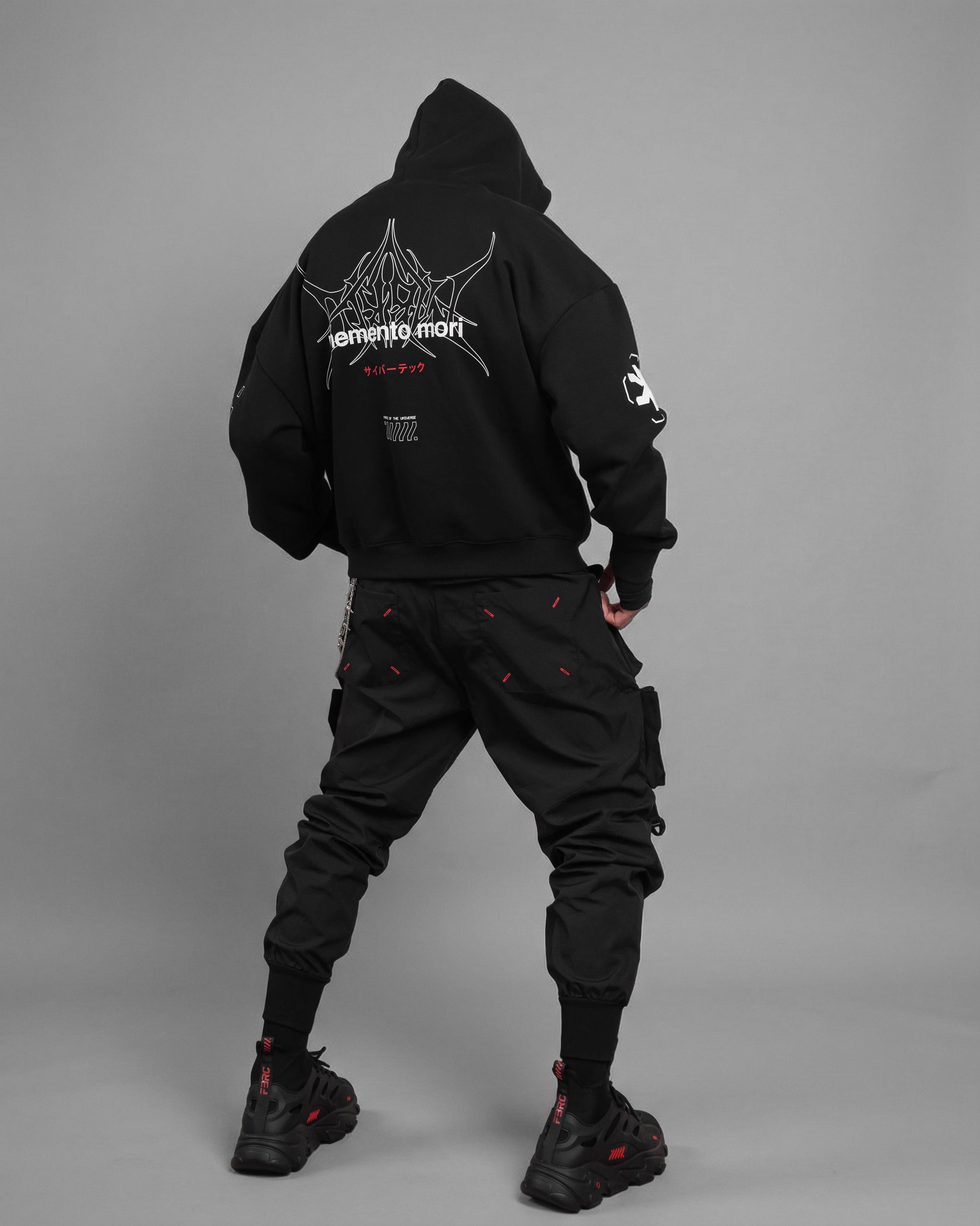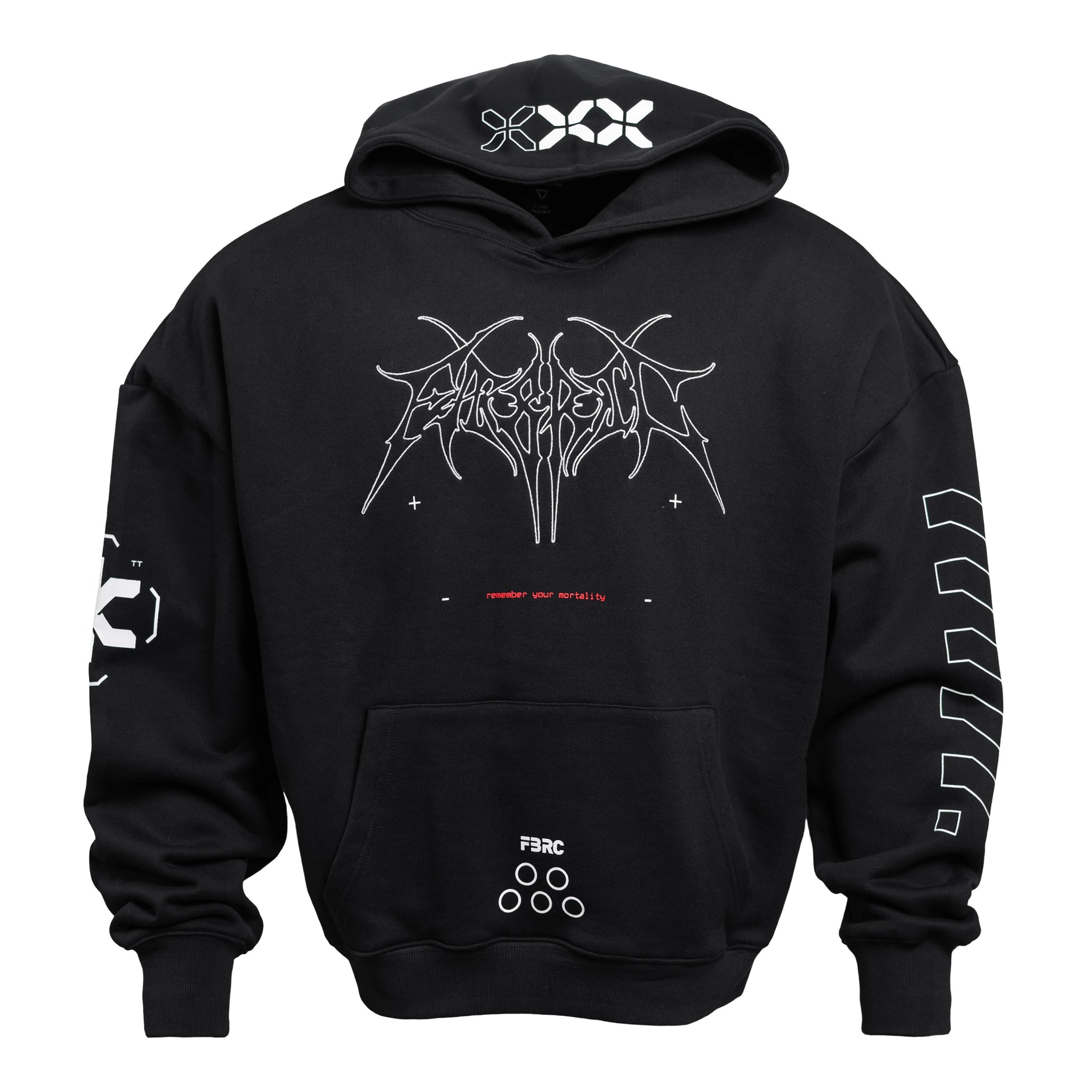 Embrace existential style with our Memento Mori Black Oversized Hoodie—a statement piece crafted from premium heavyweight French Terry that delivers both durability and all-day comfort. The thoughtfully engineered oversized silhouette features expansive shoulders balanced by a refined tapered torso, creating a flattering, intentional look. Signature logos grace every panel through a combination of embroidery and printing, making this hoodie a wearable declaration of purpose. Perfect for those who appreciate fashion with meaning.