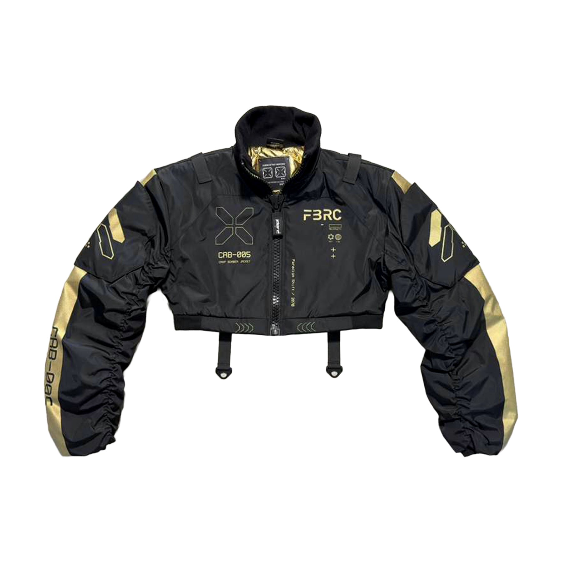 This statement-making crop bomber delivers bold style with serious substance. Crafted from heavyweight, water-resistant fabric, it withstands the elements while maintaining its sharp silhouette. The cropped cut pairs perfectly with high-waisted bottoms, while oversized sleeves feature an edgy elastic scrunch detail. What sets it apart: magnetic and Velcro-secured detachable shoulder panels let you customize your look instantly. Signature branding appears across every panel, and the striking red quilted liner with black diamond stitching adds luxury to every wear.