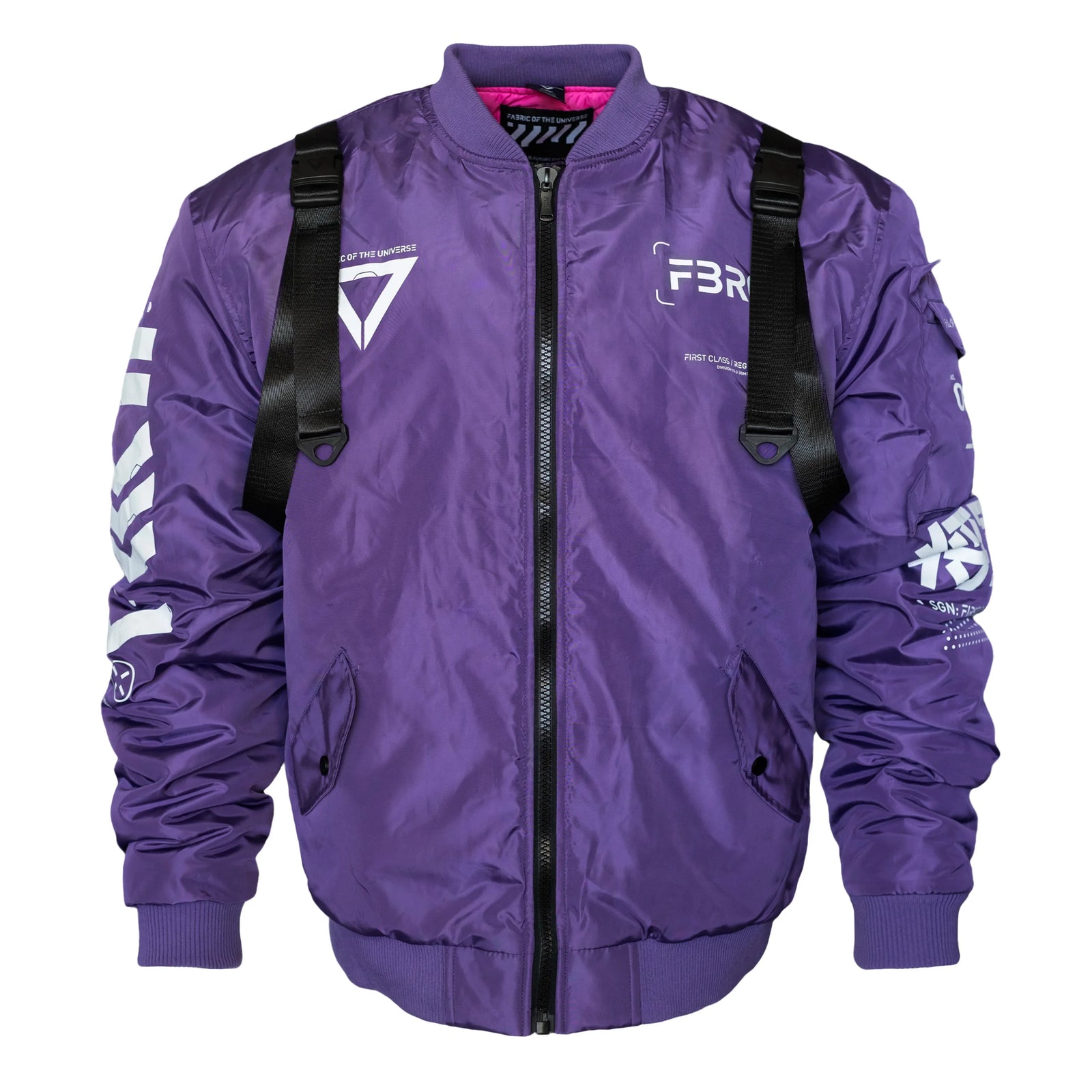 Fabric of the Universe V3-3 Purple Bomber Jacket. Broad shoulder with a unique tapered cut. Purple color. Normal US Sizing. Model is 6'0" (183cm) / 180lbs...