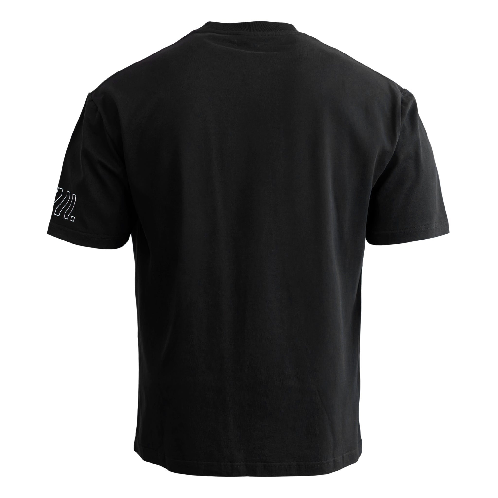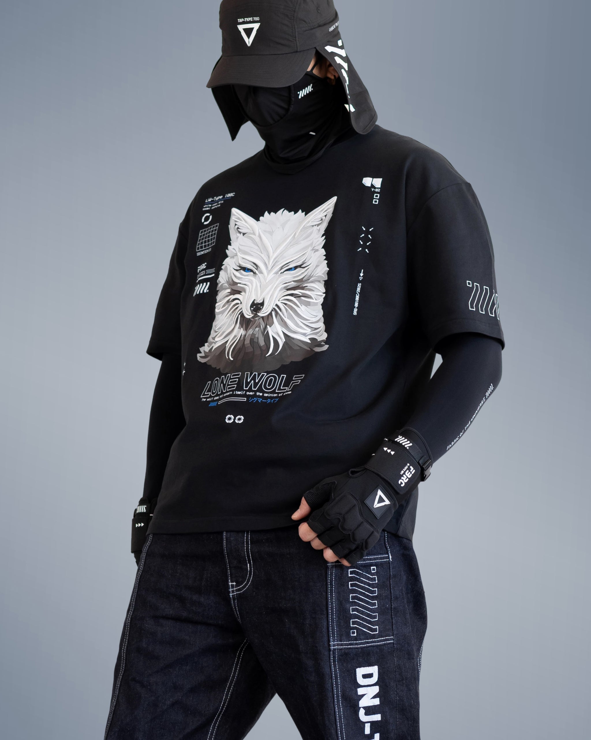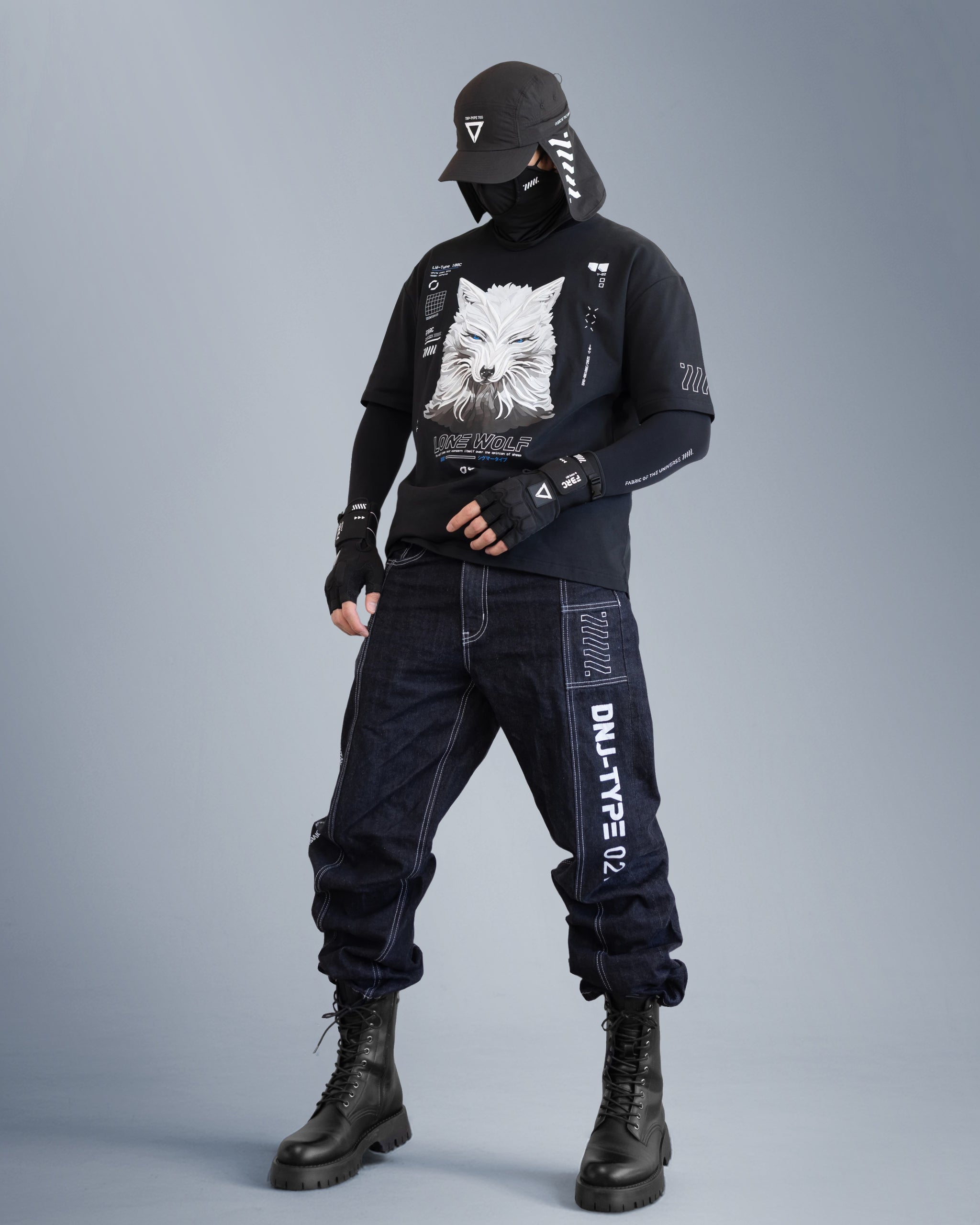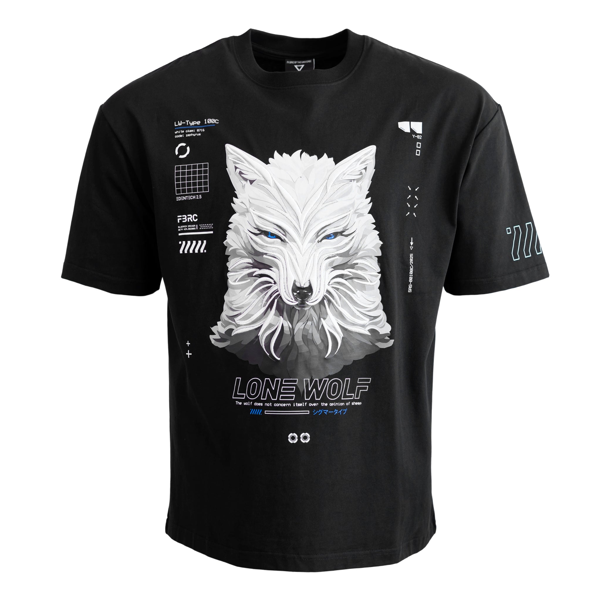 The Lone Wolf Black Embroidered short sleeve tee offers a regular fit crafted from 100% combed cotton heavyweight fabric (10 oz/280 GSM) for exceptional quality and comfort. It showcases a distinctive blue-eyed wolf graphic enhanced with embroidery for a rich, three-dimensional effect. Designed with a sturdy collar band for a refined appearance, this versatile tee pairs effortlessly with both denim and cargo pants.