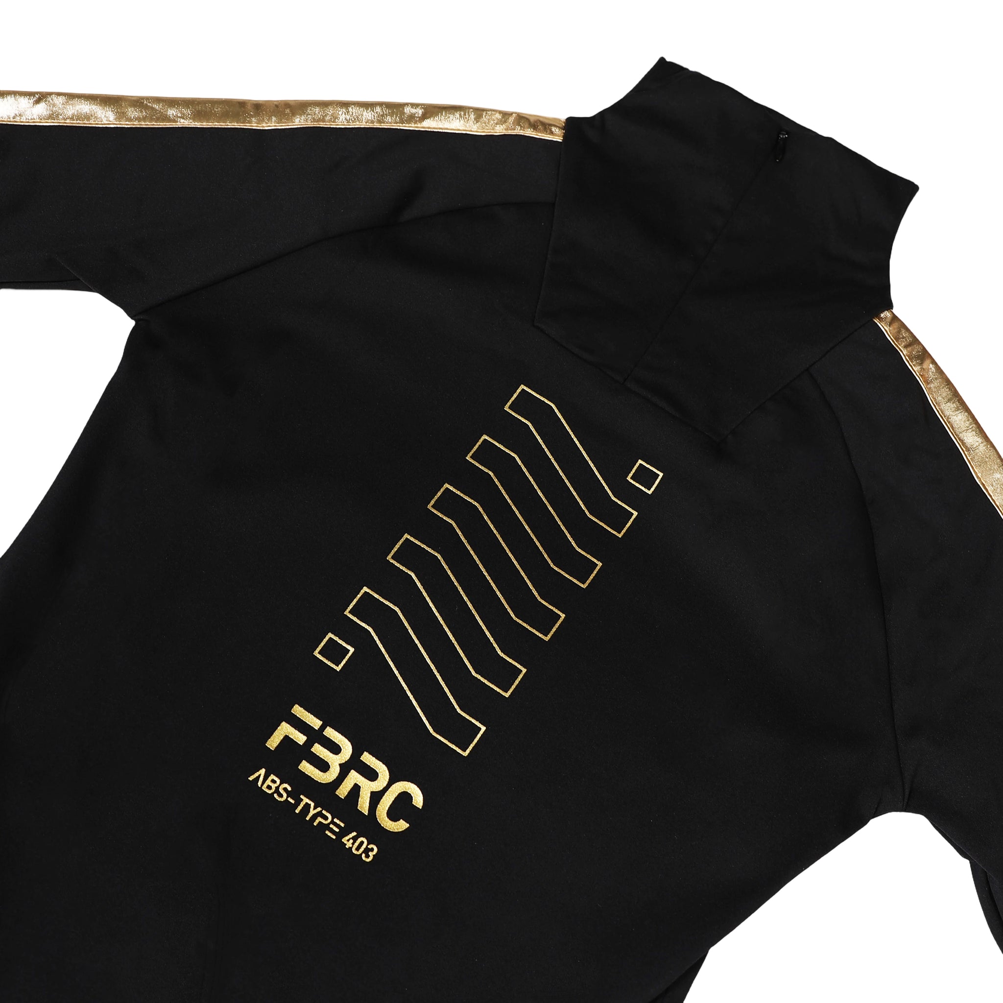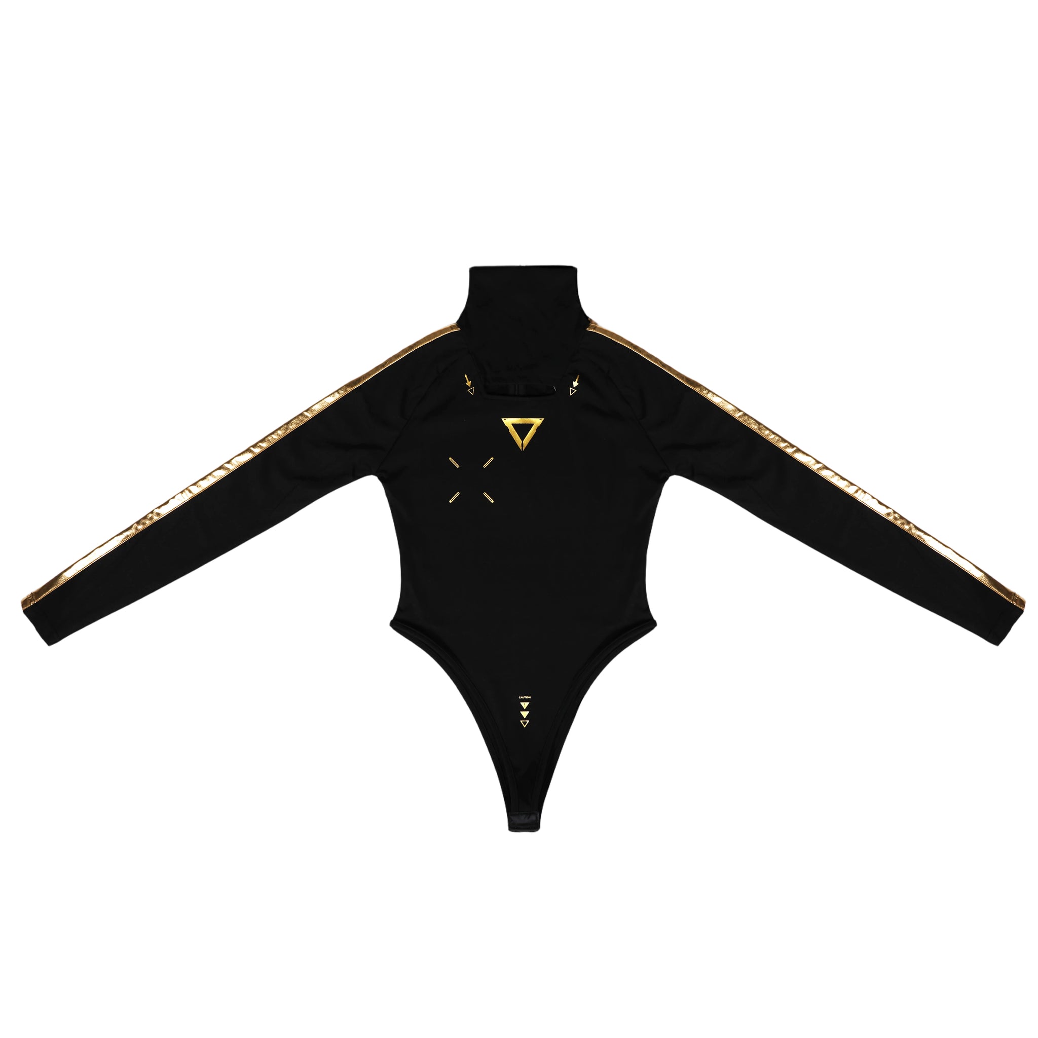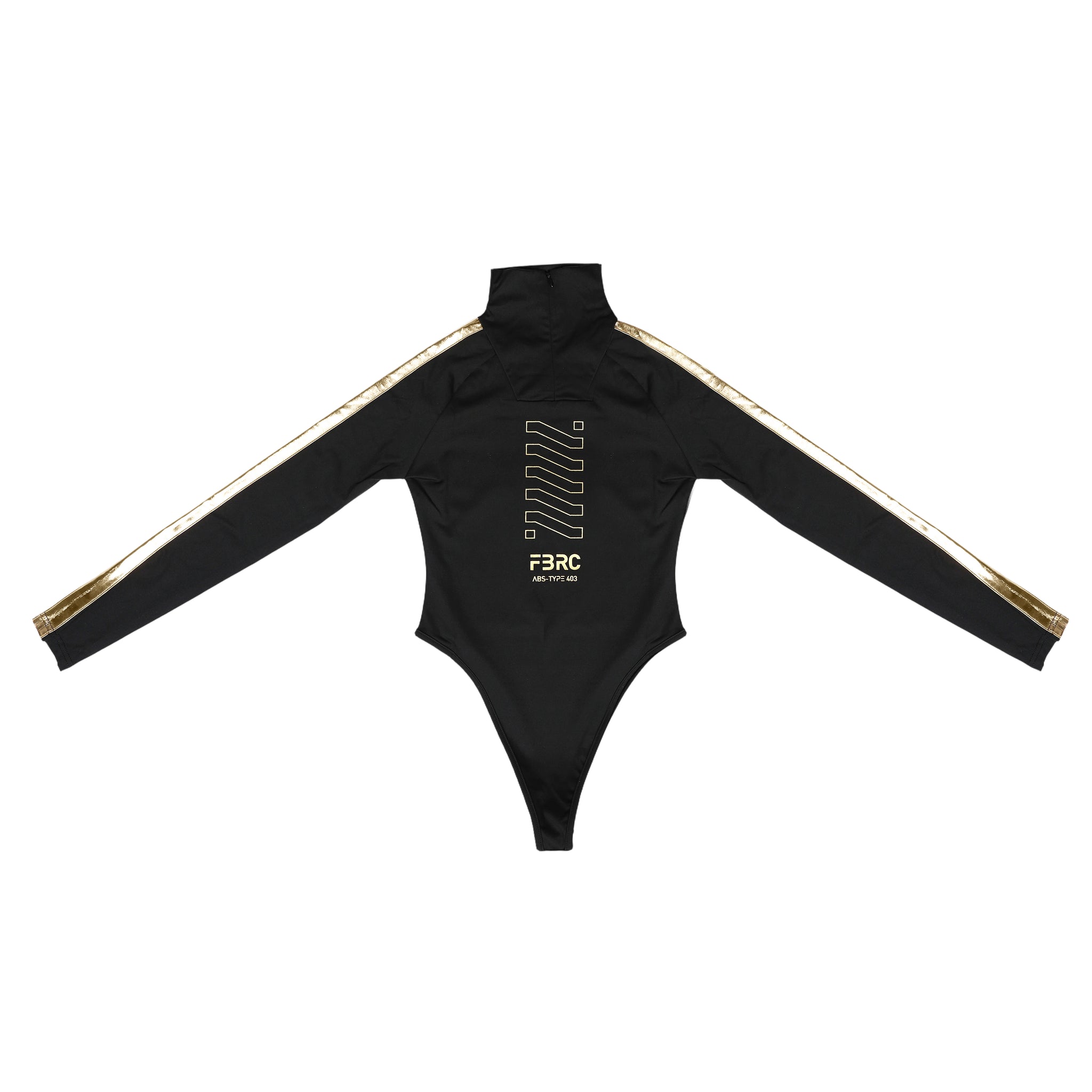 Elevate your wardrobe with this sophisticated ABS-Type 403 Black Gold Bodysuit, crafted from ultra-soft, supremely stretchy fabric that moves with you. The commanding turtleneck silhouette exudes elegance, while the convenient back zipper ensures effortless dressing. Fine-tune your comfort with three adjustable crotch hook positions designed for a personalized fit. Striking gold stripes accent the sleeves, and iconic branding adorns both front and back, making this piece a statement essential for those who demand both style and functionality.