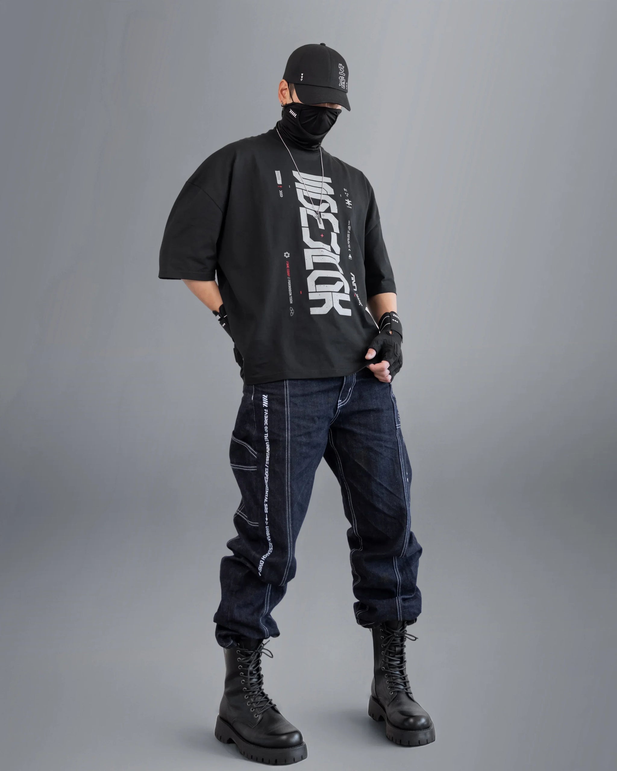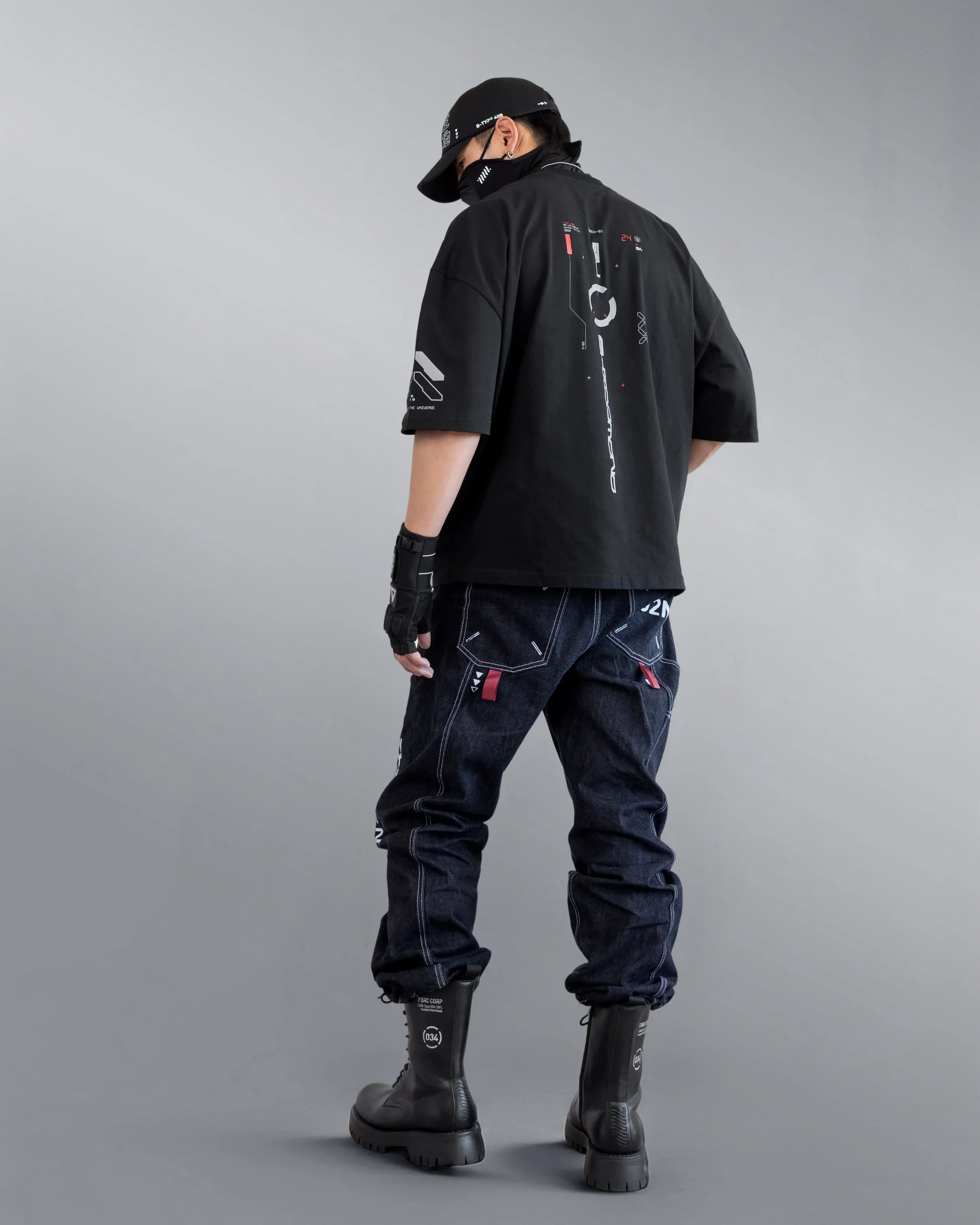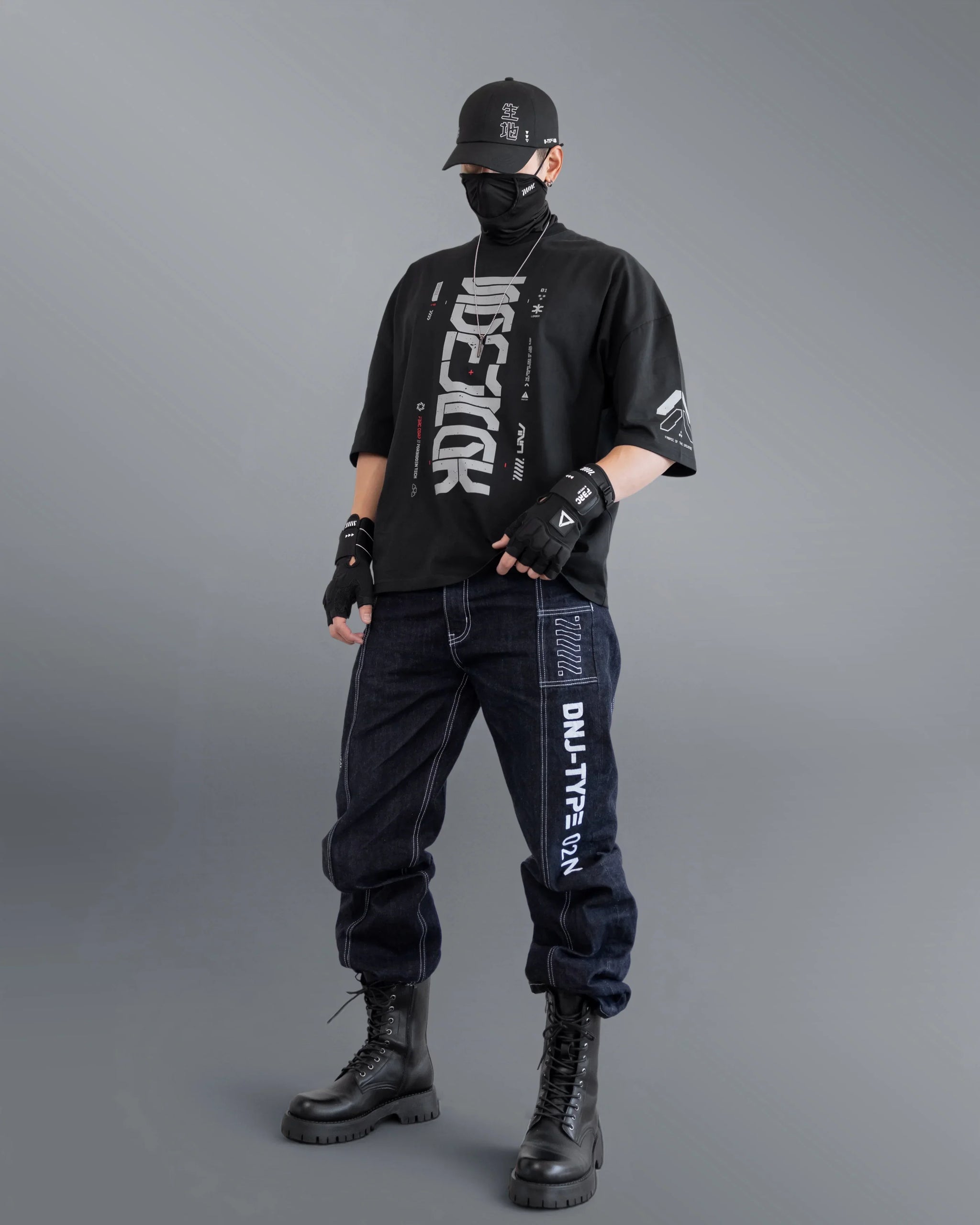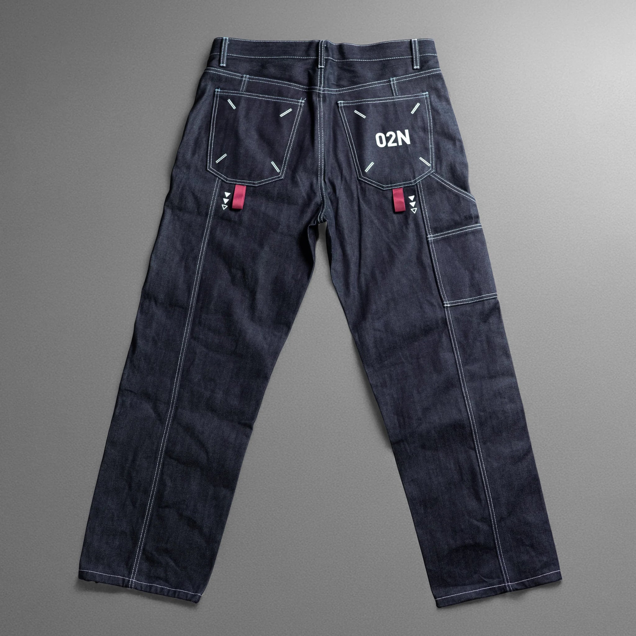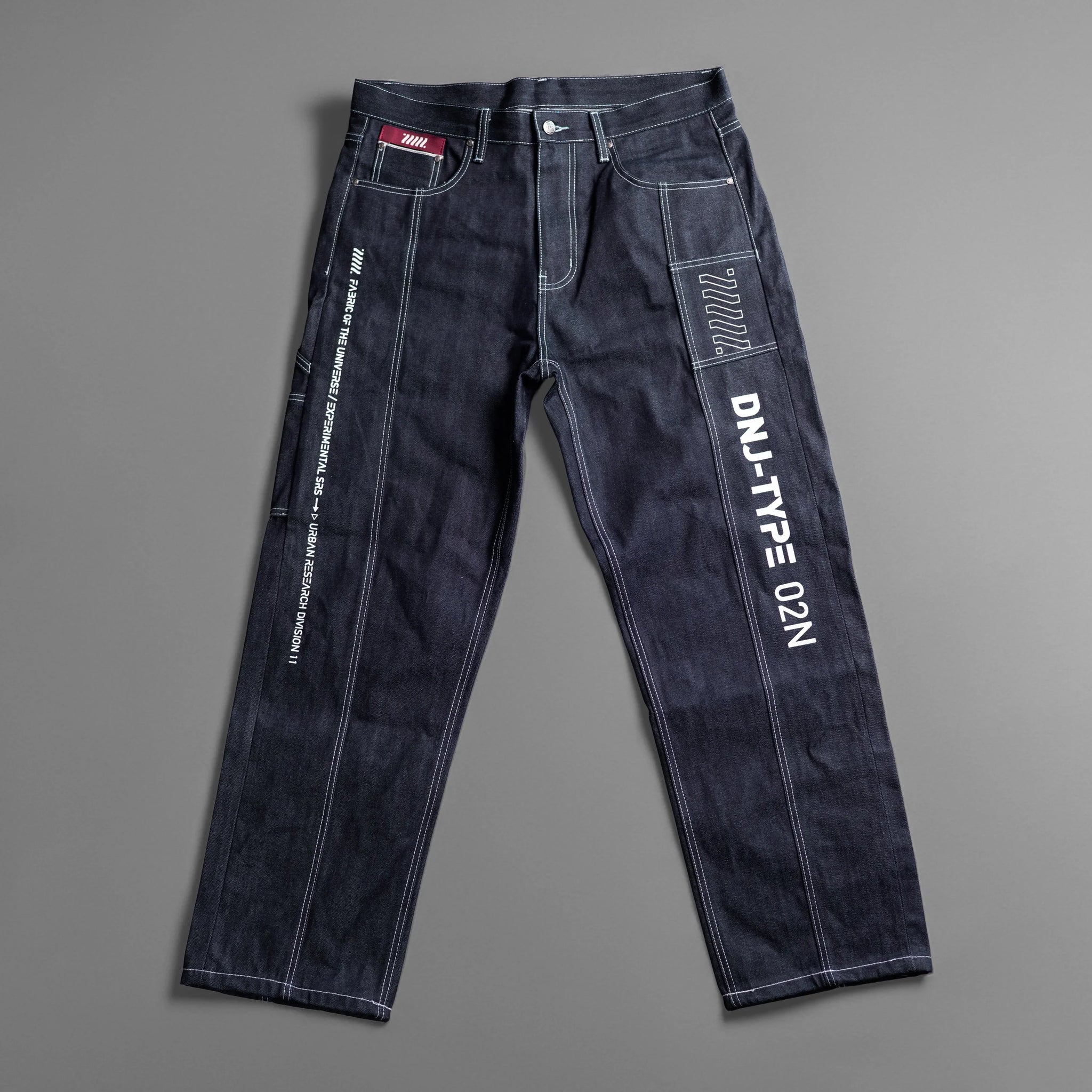 The DNJ-Type 02N Indigo Raw Denim Pants are crafted from heavyweight raw denim that initially feels stiff but gradually softens for enhanced comfort. Its distinctive panel design adds structure and highlights the contrasting white stitching. Featuring a naturally baggy fit, these pants include ankle cinch cords to transform the silhouette into a tapered jogger style. Bold, eye-catching logos are printed throughout for a daring look. With eight pockets in various sizes, including practical carpenter-style pockets, these pants offer plenty of convenient storage.