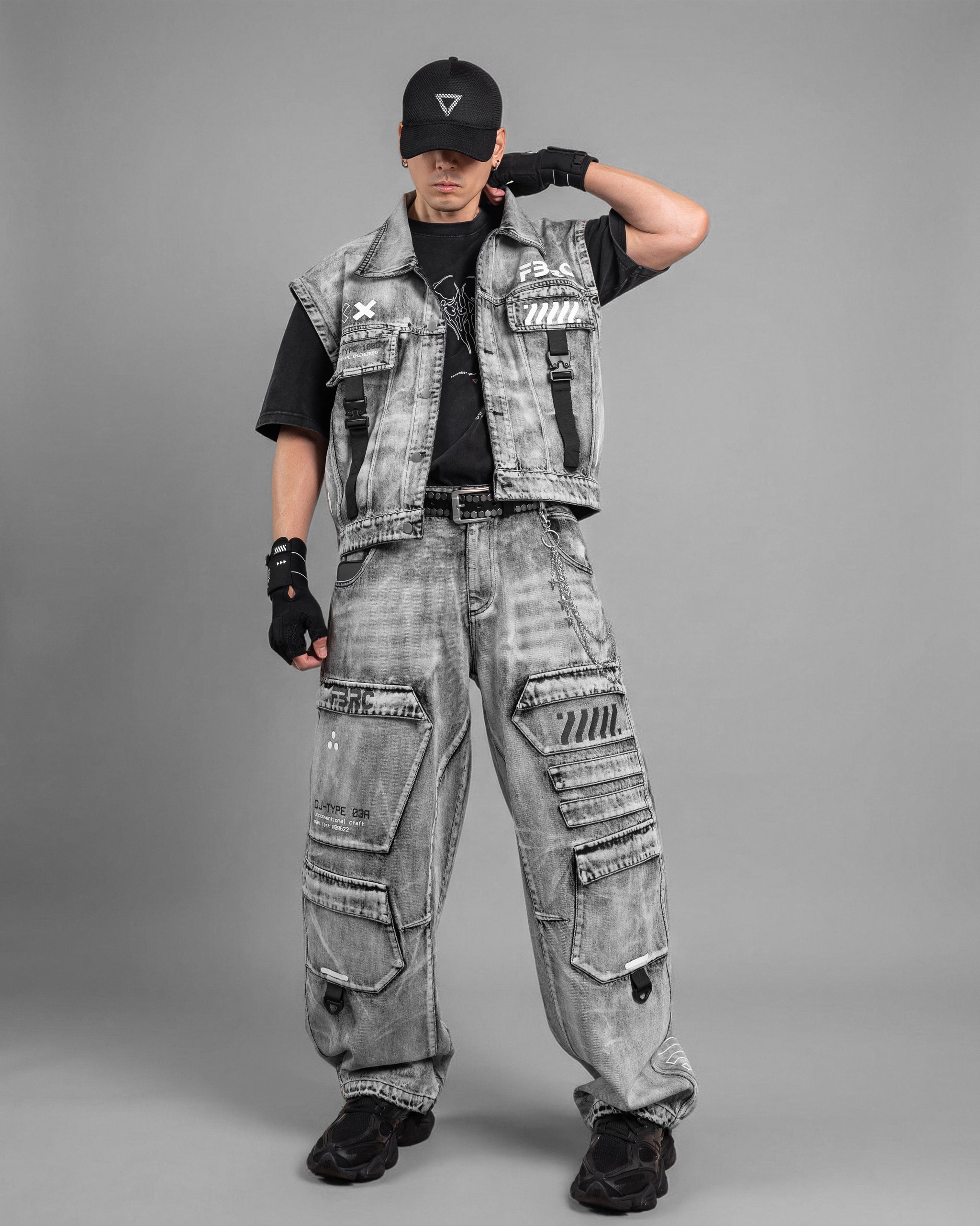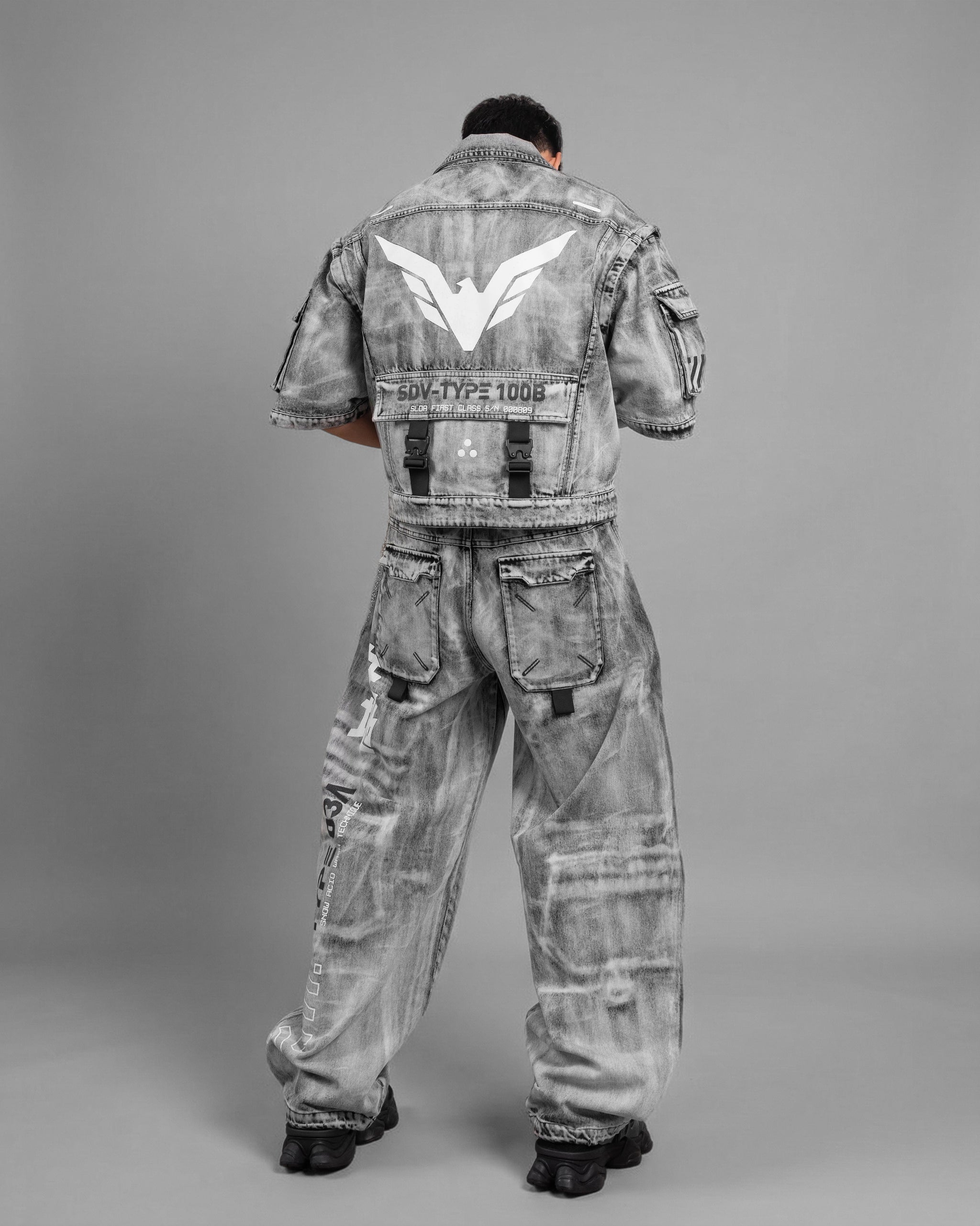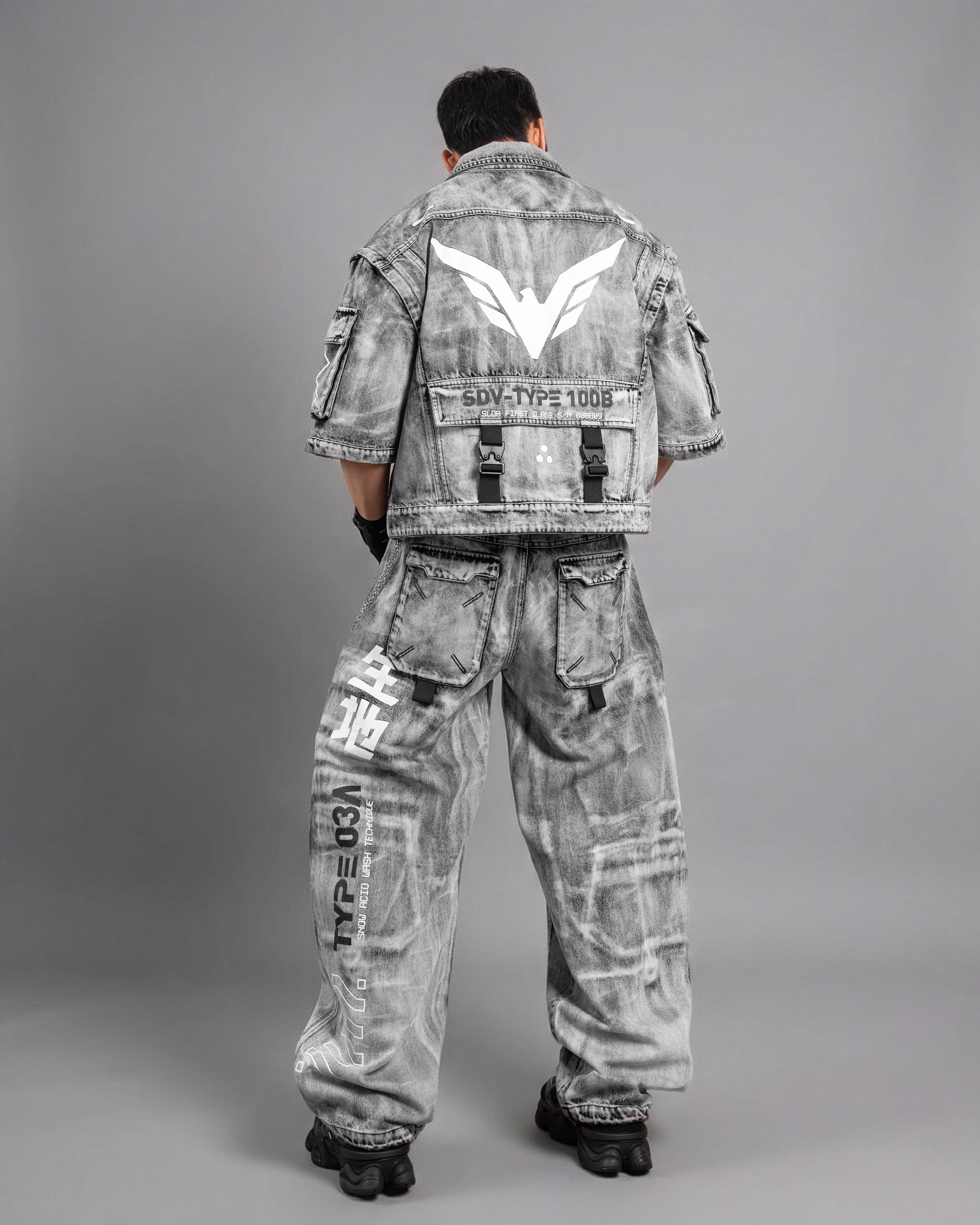 Transform your wardrobe with the SDV-Type 100B, a versatile convertible piece that adapts to your style. Crafted from premium heavyweight selvedge denim with an eye-catching snow wash finish, this jacket delivers authentic character and durability. Effortlessly shift from short-sleeve jacket to sleeveless vest with a simple unzip—perfect for layering through seasons. The oversized silhouette with broad shoulders and cropped torso creates that coveted relaxed, contemporary look. Strategic pocket placement across sleeves, chest, and back keeps essentials within reach, while signature logos on every panel showcase your distinctive taste. Built for those who demand both function and fashion-forward design.